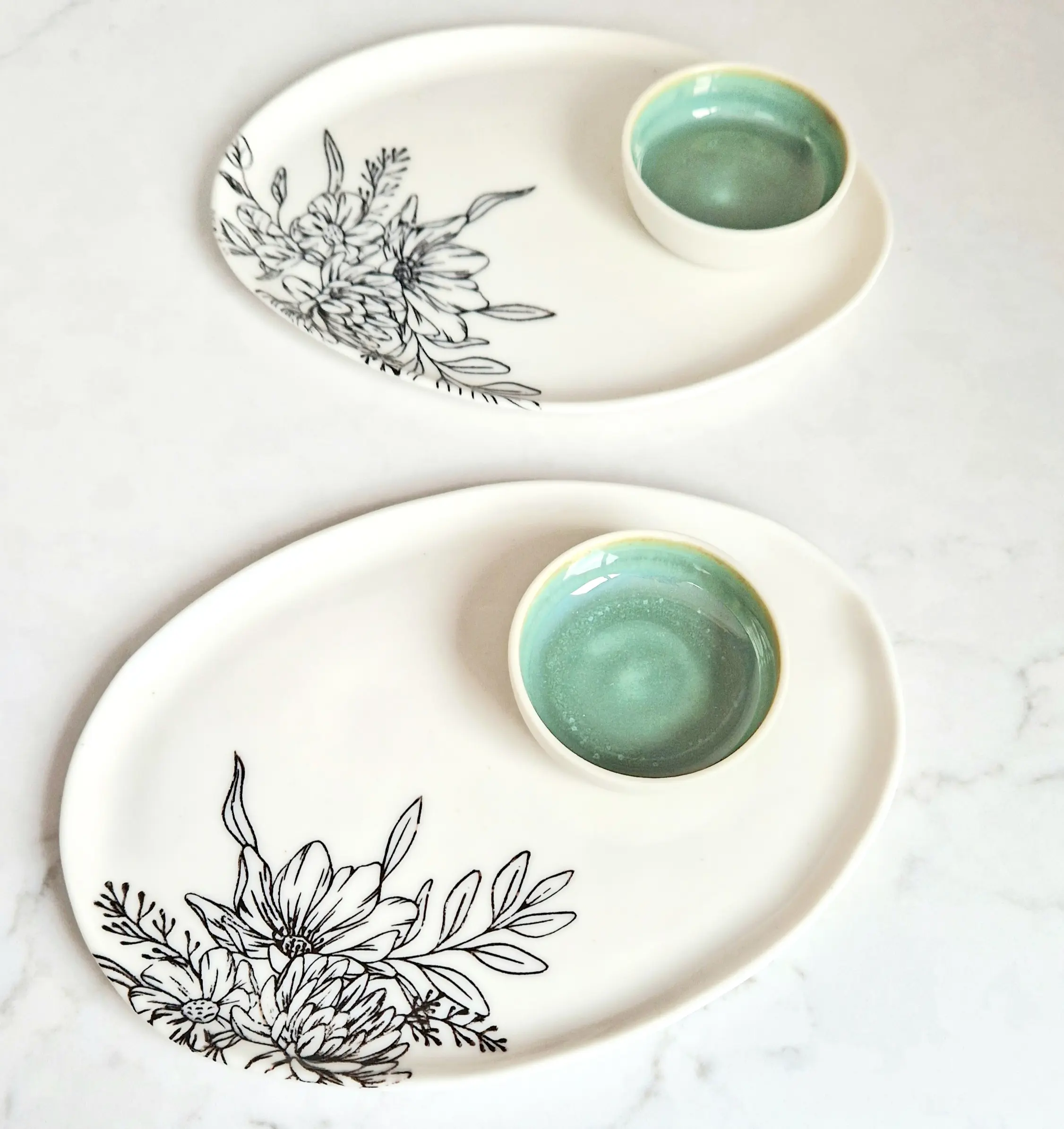 The serving plate is crafted from white porcelain clay and is beautifully printed with handmade black floral print, Finished with a glossy clear glaze. The coordinating mini dish is available in two stunning glaze options: deep sea foam green or smoky blue-grey.
